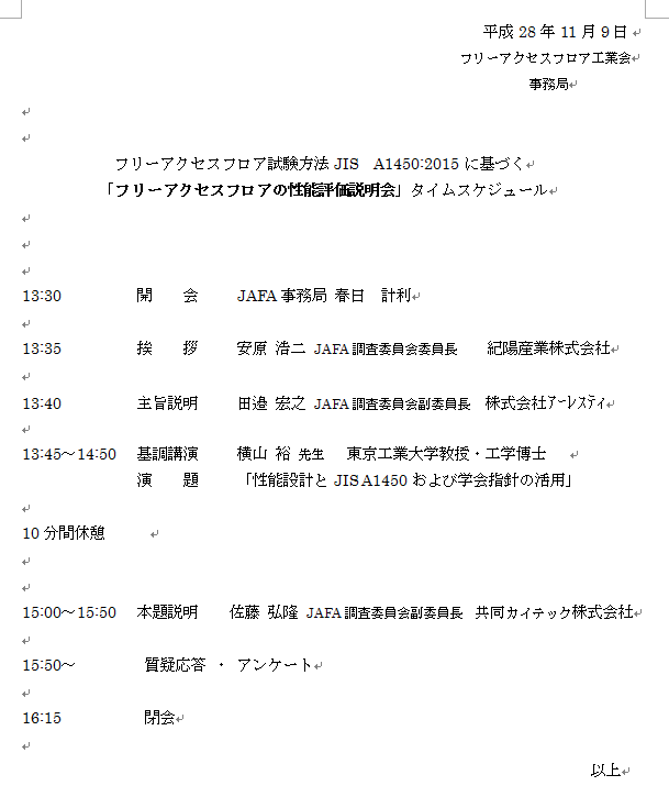 2016/12/27JAFA性能評価説明会(2016.11.9)を開催しました。 2016年11月9日(水) 「JIS A 1450:2015フリーアクセスフロア試験方法」の説明会を 大阪コングレコンベンションセンターで開催しました。 当日は当会HP上から参申込みをいただいた方々で満席の中、真剣な眼差しと 質疑応答ならびにアンケートをいただき、熱のこもった一日でした。 ご参加いただきました皆様にはこの場を借りまして厚く御礼申し上げます。 JAFA事務局